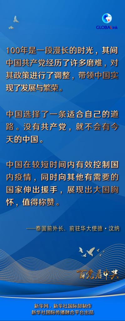 新華社曼谷5月29日電 “100年是一段漫長的時光,其間中國共產(chǎn)黨經(jīng)歷了許多磨難,對其政策進行了調(diào)整,帶領(lǐng)中國實現(xiàn)了發(fā)展與繁榮。”泰國前外長、前駐華大使德·汶納日前在曼谷接受新華社專訪時說。