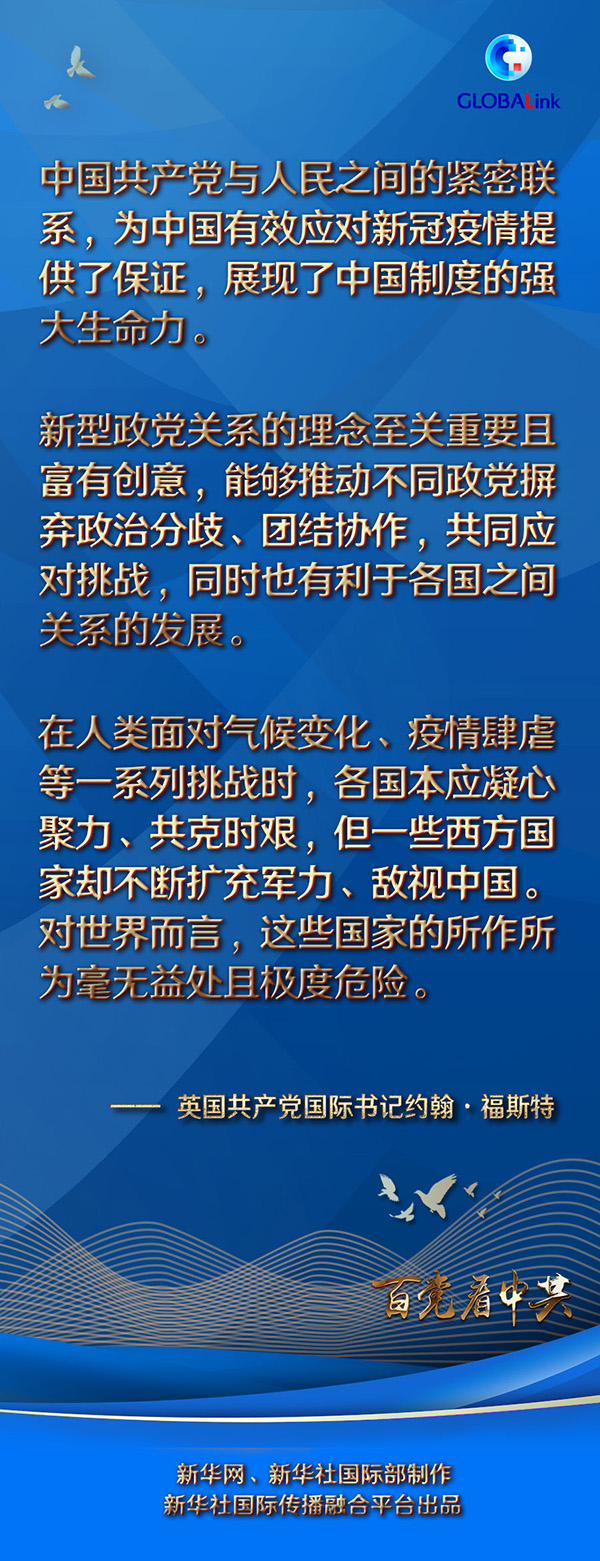 福斯特表示,作為一個領(lǐng)導(dǎo)著世界上人口最多國家的百年大黨,中共倡導(dǎo)建立新型政黨關(guān)系和構(gòu)建人類命運共同體,對促進世界的和平與發(fā)展具有重要意義。