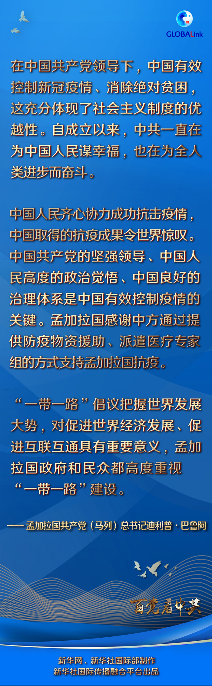 巴魯阿表示,百年來(lái),中國(guó)共產(chǎn)黨根據(jù)本國(guó)國(guó)情不斷繼承和發(fā)展馬克思主義,并在這一過(guò)程中實(shí)現(xiàn)發(fā)展壯大。孟加拉國(guó)共產(chǎn)黨(馬列)與中國(guó)共產(chǎn)黨保持著兄弟般的關(guān)系。1976年以來(lái),兩黨經(jīng)常派遣代表團(tuán)互訪。訪問(wèn)中國(guó)期間,中國(guó)共產(chǎn)黨的干部給他留下了深刻印象。巴魯阿說(shuō):“他們責(zé)任感強(qiáng)、熱情友好、理論經(jīng)驗(yàn)豐富。在交流中,我們真切感受到,中共在建設(shè)中國(guó)特色社會(huì)主義道路上不斷前進(jìn),這讓人欽佩、印象深刻。”